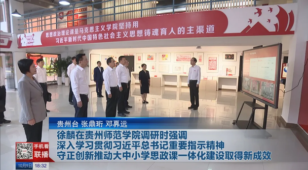 10月9日,省委书记徐麟到贵州师范学院调研大中小学思政课一体化建设工作。他强调,要深入学习贯彻习近平总书记关于思政课建设的重要指示精神,把思政课建设作为党领导教育工作的重中之重来抓,落实立德树人根本任务,守正创新推动贵州大中小学思政课一体化建设取得新成效。省委副书记马汉成,省领导卢雍政、郭强、张敬平参加。